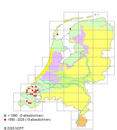 Het aantal atlasblokken (5x5 km) waarin de soort is gemeld binnen een periode van vijf jaar (vanaf 1980) of twintig jaar. Niet gecorrigeerd voor waarnemersinspanning en het aantal doorgegeven waarnemingen kan sterk variëren per periode, dus een trend in verspreiding kan hier niet direct uit worden afgelezen. Het opgegeven jaartal is het eerste jaar van de periode. Bron: gevalideerde waarnemingen uit de NDFF.
