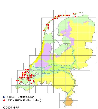 Het aantal atlasblokken (5x5 km) waarin de soort is gemeld binnen een periode van vijf jaar (vanaf 1980) of twintig jaar. Niet gecorrigeerd voor waarnemersinspanning en het aantal doorgegeven waarnemingen kan sterk variëren per periode, dus een trend in verspreiding kan hier niet direct uit worden afgelezen. Het opgegeven jaartal is het eerste jaar van de periode. Bron: gevalideerde waarnemingen uit de NDFF.