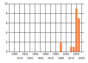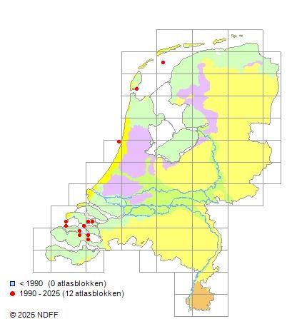 Het aantal atlasblokken (5x5 km) waarin de soort is gemeld binnen een periode van vijf jaar (vanaf 1980) of twintig jaar. Niet gecorrigeerd voor waarnemersinspanning en het aantal doorgegeven waarnemingen kan sterk variëren per periode, dus een trend in verspreiding kan hier niet direct uit worden afgelezen. Het opgegeven jaartal is het eerste jaar van de periode. Bron: gevalideerde waarnemingen uit de NDFF.