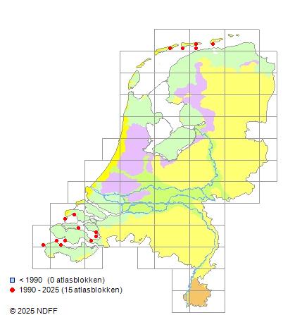 Het aantal atlasblokken (5x5 km) waarin de soort is gemeld binnen een periode van vijf jaar (vanaf 1980) of twintig jaar. Niet gecorrigeerd voor waarnemersinspanning en het aantal doorgegeven waarnemingen kan sterk variëren per periode, dus een trend in verspreiding kan hier niet direct uit worden afgelezen. Het opgegeven jaartal is het eerste jaar van de periode. Bron: gevalideerde waarnemingen uit de NDFF.