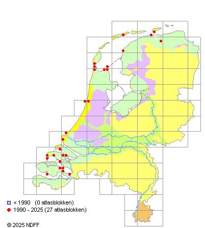 Het aantal atlasblokken (5x5 km) waarin de soort is gemeld binnen een periode van vijf jaar (vanaf 1980) of twintig jaar. Niet gecorrigeerd voor waarnemersinspanning en het aantal doorgegeven waarnemingen kan sterk variëren per periode, dus een trend in verspreiding kan hier niet direct uit worden afgelezen. Het opgegeven jaartal is het eerste jaar van de periode. Bron: gevalideerde waarnemingen uit de NDFF.