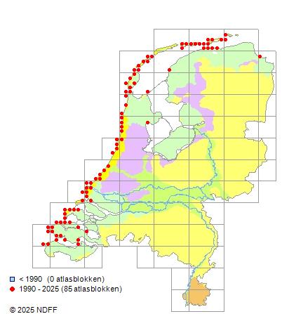 Het aantal atlasblokken (5x5 km) waarin de soort is gemeld binnen een periode van vijf jaar (vanaf 1980) of twintig jaar. Niet gecorrigeerd voor waarnemersinspanning en het aantal doorgegeven waarnemingen kan sterk variëren per periode, dus een trend in verspreiding kan hier niet direct uit worden afgelezen. Het opgegeven jaartal is het eerste jaar van de periode. Bron: gevalideerde waarnemingen uit de NDFF.