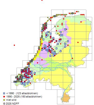 Het aantal atlasblokken (5x5 km) waarin de soort is gemeld binnen een periode van vijf jaar (vanaf 1980) of twintig jaar. Niet gecorrigeerd voor waarnemersinspanning en het aantal doorgegeven waarnemingen kan sterk variëren per periode, dus een trend in verspreiding kan hier niet direct uit worden afgelezen. Het opgegeven jaartal is het eerste jaar van de periode. Bron: gevalideerde waarnemingen uit de NDFF.