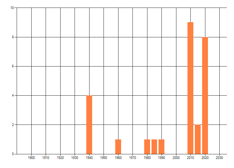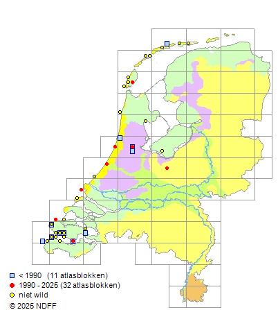 Het aantal atlasblokken (5x5 km) waarin de soort is gemeld binnen een periode van vijf jaar (vanaf 1980) of twintig jaar. Niet gecorrigeerd voor waarnemersinspanning en het aantal doorgegeven waarnemingen kan sterk variëren per periode, dus een trend in verspreiding kan hier niet direct uit worden afgelezen. Het opgegeven jaartal is het eerste jaar van de periode. Bron: gevalideerde waarnemingen uit de NDFF.