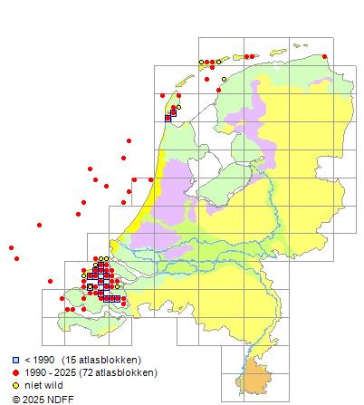 Het aantal atlasblokken (5x5 km) waarin de soort is gemeld binnen een periode van vijf jaar (vanaf 1980) of twintig jaar. Niet gecorrigeerd voor waarnemersinspanning en het aantal doorgegeven waarnemingen kan sterk variëren per periode, dus een trend in verspreiding kan hier niet direct uit worden afgelezen. Het opgegeven jaartal is het eerste jaar van de periode. Bron: gevalideerde waarnemingen uit de NDFF.
