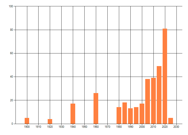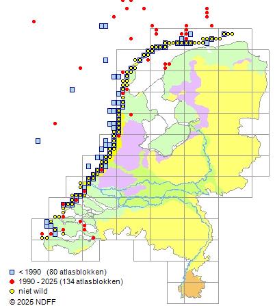 Het aantal atlasblokken (5x5 km) waarin de soort is gemeld binnen een periode van vijf jaar (vanaf 1980) of twintig jaar. Niet gecorrigeerd voor waarnemersinspanning en het aantal doorgegeven waarnemingen kan sterk variëren per periode, dus een trend in verspreiding kan hier niet direct uit worden afgelezen. Het opgegeven jaartal is het eerste jaar van de periode. Bron: gevalideerde waarnemingen uit de NDFF.