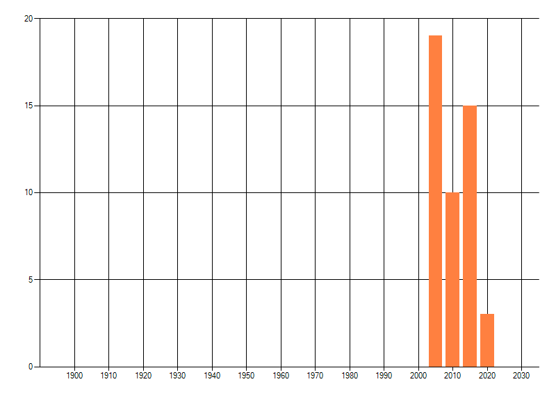 Het aantal atlasblokken (5x5 km) waarin de soort is gemeld binnen een periode van vijf jaar (vanaf 1980) of twintig jaar. Niet gecorrigeerd voor waarnemersinspanning en het aantal doorgegeven waarnemingen kan sterk variëren per periode, dus een trend in verspreiding kan hier niet direct uit worden afgelezen. Het opgegeven jaartal is het eerste jaar van de periode. Bron: gevalideerde waarnemingen uit de NDFF.