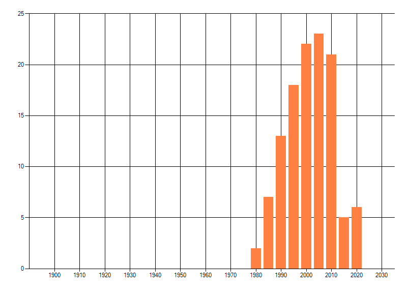 Het aantal atlasblokken (5x5 km) waarin de soort is gemeld binnen een periode van vijf jaar (vanaf 1980) of twintig jaar. Niet gecorrigeerd voor waarnemersinspanning en het aantal doorgegeven waarnemingen kan sterk variëren per periode, dus een trend in verspreiding kan hier niet direct uit worden afgelezen. Het opgegeven jaartal is het eerste jaar van de periode. Bron: gevalideerde waarnemingen uit de NDFF.