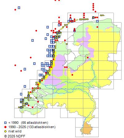 Het aantal atlasblokken (5x5 km) waarin de soort is gemeld binnen een periode van vijf jaar (vanaf 1980) of twintig jaar. Niet gecorrigeerd voor waarnemersinspanning en het aantal doorgegeven waarnemingen kan sterk variëren per periode, dus een trend in verspreiding kan hier niet direct uit worden afgelezen. Het opgegeven jaartal is het eerste jaar van de periode. Bron: gevalideerde waarnemingen uit de NDFF.
