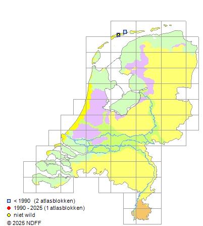 Het aantal atlasblokken (5x5 km) waarin de soort is gemeld binnen een periode van vijf jaar (vanaf 1980) of twintig jaar. Niet gecorrigeerd voor waarnemersinspanning en het aantal doorgegeven waarnemingen kan sterk variëren per periode, dus een trend in verspreiding kan hier niet direct uit worden afgelezen. Het opgegeven jaartal is het eerste jaar van de periode. Bron: gevalideerde waarnemingen uit de NDFF.