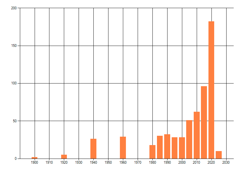 Het aantal atlasblokken (5x5 km) waarin de soort is gemeld binnen een periode van vijf jaar (vanaf 1980) of twintig jaar. Niet gecorrigeerd voor waarnemersinspanning en het aantal doorgegeven waarnemingen kan sterk variëren per periode, dus een trend in verspreiding kan hier niet direct uit worden afgelezen. Het opgegeven jaartal is het eerste jaar van de periode. Bron: gevalideerde waarnemingen uit de NDFF.