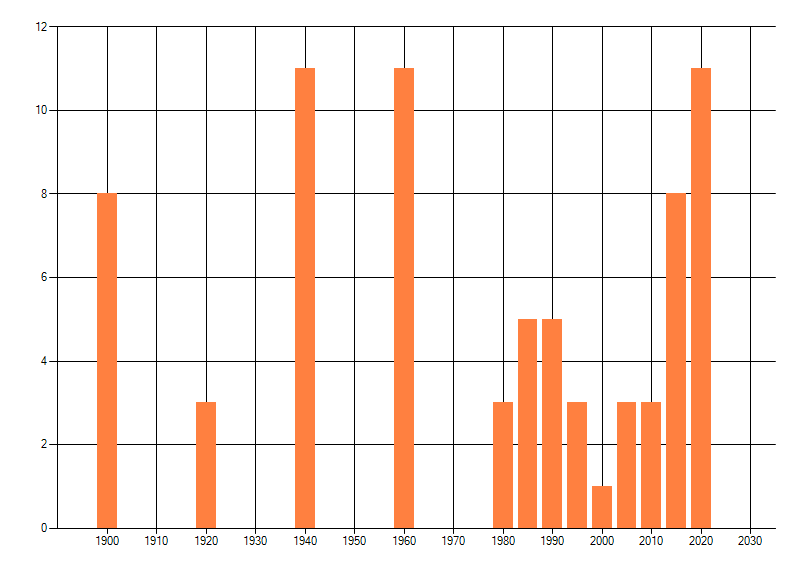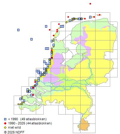 Het aantal atlasblokken (5x5 km) waarin de soort is gemeld binnen een periode van vijf jaar (vanaf 1980) of twintig jaar. Niet gecorrigeerd voor waarnemersinspanning en het aantal doorgegeven waarnemingen kan sterk variëren per periode, dus een trend in verspreiding kan hier niet direct uit worden afgelezen. Het opgegeven jaartal is het eerste jaar van de periode. Bron: gevalideerde waarnemingen uit de NDFF.