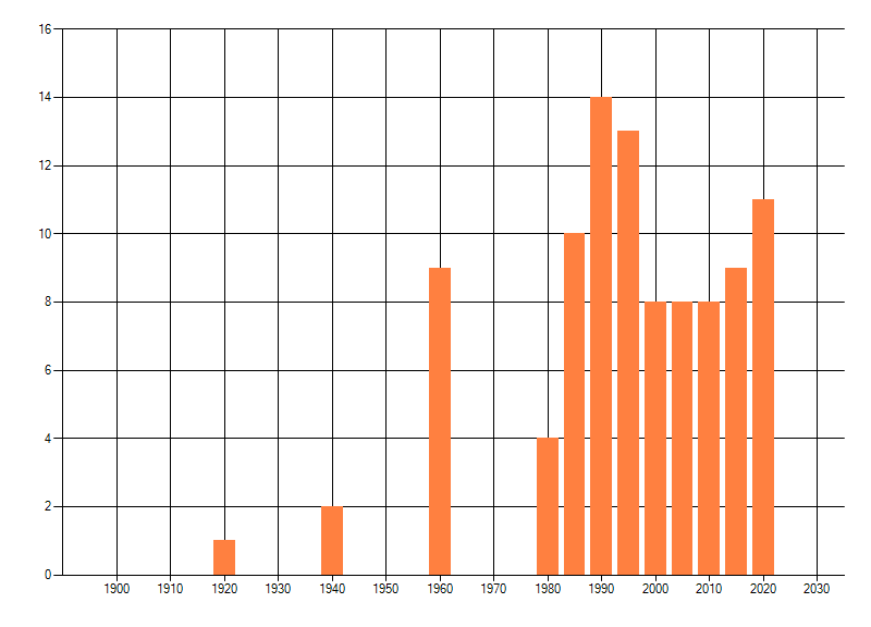 Het aantal atlasblokken (5x5 km) waarin de soort is gemeld binnen een periode van vijf jaar (vanaf 1980) of twintig jaar. Niet gecorrigeerd voor waarnemersinspanning en het aantal doorgegeven waarnemingen kan sterk variëren per periode, dus een trend in verspreiding kan hier niet direct uit worden afgelezen. Het opgegeven jaartal is het eerste jaar van de periode. Bron: gevalideerde waarnemingen uit de NDFF.