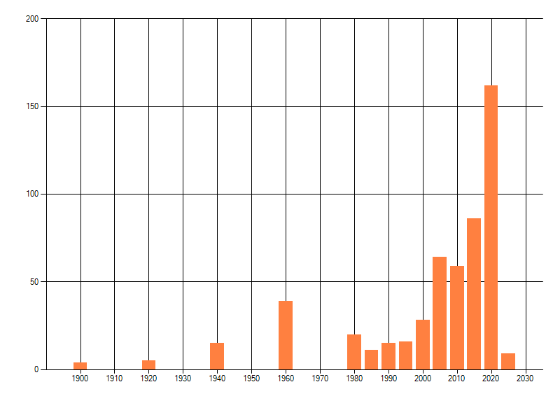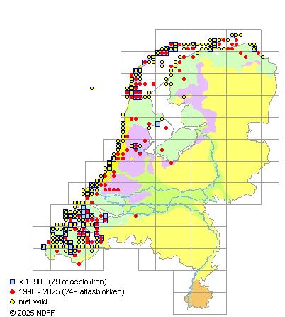 Het aantal atlasblokken (5x5 km) waarin de soort is gemeld binnen een periode van vijf jaar (vanaf 1980) of twintig jaar. Niet gecorrigeerd voor waarnemersinspanning en het aantal doorgegeven waarnemingen kan sterk variëren per periode, dus een trend in verspreiding kan hier niet direct uit worden afgelezen. Het opgegeven jaartal is het eerste jaar van de periode. Bron: gevalideerde waarnemingen uit de NDFF.