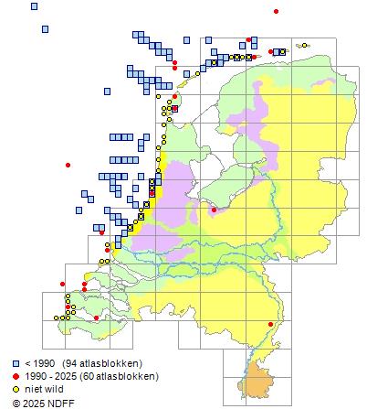 Het aantal atlasblokken (5x5 km) waarin de soort is gemeld binnen een periode van vijf jaar (vanaf 1980) of twintig jaar. Niet gecorrigeerd voor waarnemersinspanning en het aantal doorgegeven waarnemingen kan sterk variëren per periode, dus een trend in verspreiding kan hier niet direct uit worden afgelezen. Het opgegeven jaartal is het eerste jaar van de periode. Bron: gevalideerde waarnemingen uit de NDFF.