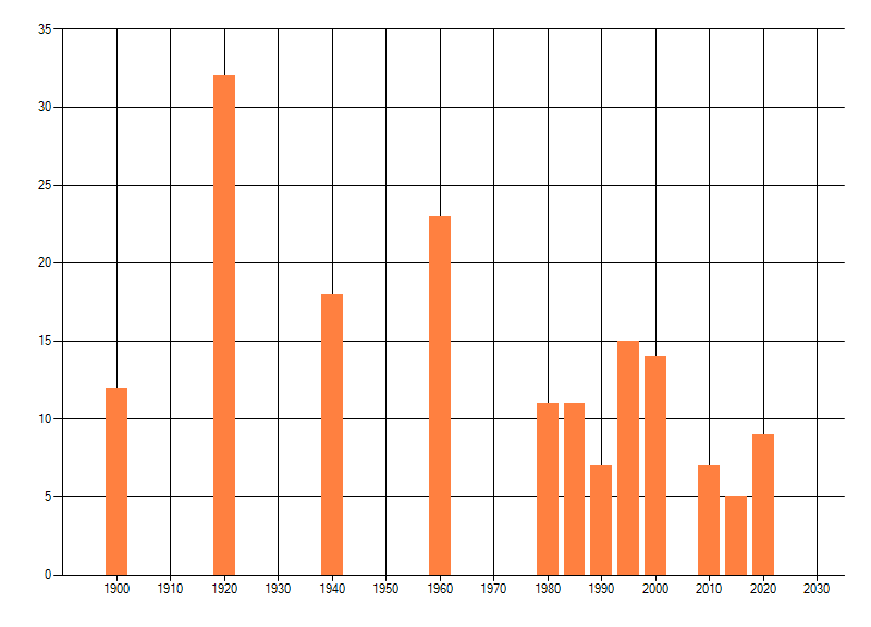 Het aantal atlasblokken (5x5 km) waarin de soort is gemeld binnen een periode van vijf jaar (vanaf 1980) of twintig jaar. Niet gecorrigeerd voor waarnemersinspanning en het aantal doorgegeven waarnemingen kan sterk variëren per periode, dus een trend in verspreiding kan hier niet direct uit worden afgelezen. Het opgegeven jaartal is het eerste jaar van de periode. Bron: gevalideerde waarnemingen uit de NDFF.