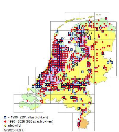 Het aantal atlasblokken (5x5 km) waarin de soort is gemeld binnen een periode van vijf jaar (vanaf 1980) of twintig jaar. Niet gecorrigeerd voor waarnemersinspanning en het aantal doorgegeven waarnemingen kan sterk variëren per periode, dus een trend in verspreiding kan hier niet direct uit worden afgelezen. Het opgegeven jaartal is het eerste jaar van de periode. Bron: gevalideerde waarnemingen uit de NDFF.
