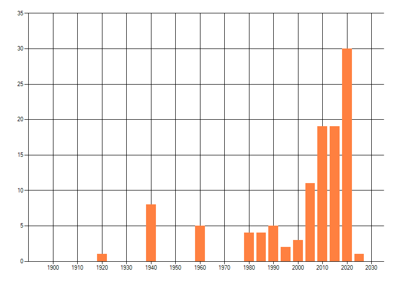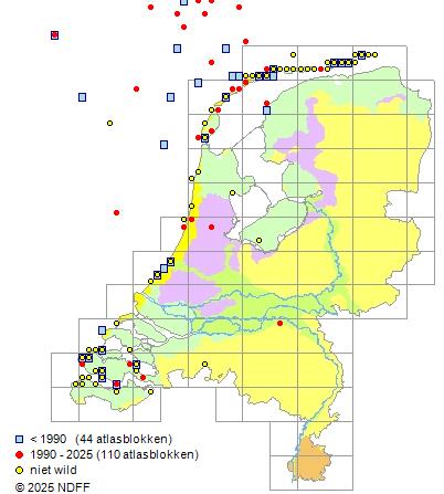 Het aantal atlasblokken (5x5 km) waarin de soort is gemeld binnen een periode van vijf jaar (vanaf 1980) of twintig jaar. Niet gecorrigeerd voor waarnemersinspanning en het aantal doorgegeven waarnemingen kan sterk variëren per periode, dus een trend in verspreiding kan hier niet direct uit worden afgelezen. Het opgegeven jaartal is het eerste jaar van de periode. Bron: gevalideerde waarnemingen uit de NDFF.
