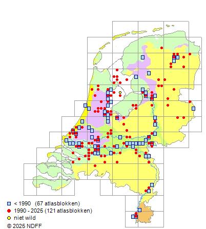 Het aantal atlasblokken (5x5 km) waarin de soort is gemeld binnen een periode van vijf jaar (vanaf 1980) of twintig jaar. Niet gecorrigeerd voor waarnemersinspanning en het aantal doorgegeven waarnemingen kan sterk variëren per periode, dus een trend in verspreiding kan hier niet direct uit worden afgelezen. Het opgegeven jaartal is het eerste jaar van de periode. Bron: gevalideerde waarnemingen uit de NDFF.