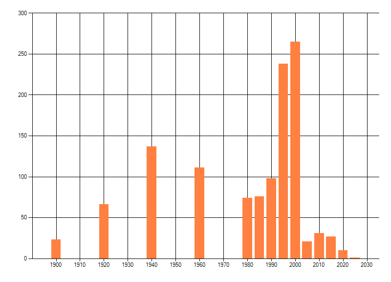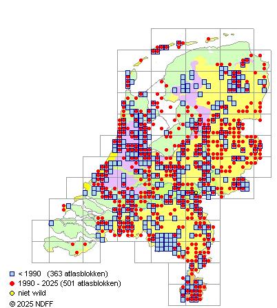 Het aantal atlasblokken (5x5 km) waarin de soort is gemeld binnen een periode van vijf jaar (vanaf 1980) of twintig jaar. Niet gecorrigeerd voor waarnemersinspanning en het aantal doorgegeven waarnemingen kan sterk variëren per periode, dus een trend in verspreiding kan hier niet direct uit worden afgelezen. Het opgegeven jaartal is het eerste jaar van de periode. Bron: gevalideerde waarnemingen uit de NDFF.