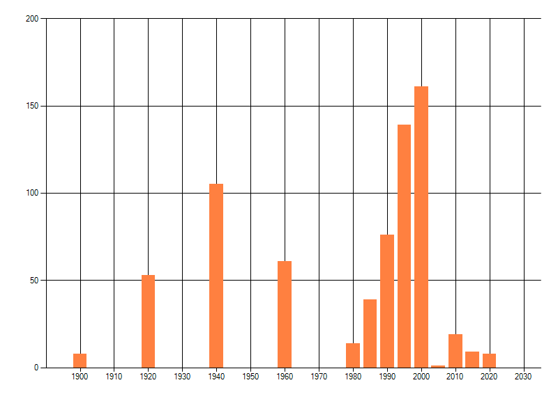 Het aantal atlasblokken (5x5 km) waarin de soort is gemeld binnen een periode van vijf jaar (vanaf 1980) of twintig jaar. Niet gecorrigeerd voor waarnemersinspanning en het aantal doorgegeven waarnemingen kan sterk variëren per periode, dus een trend in verspreiding kan hier niet direct uit worden afgelezen. Het opgegeven jaartal is het eerste jaar van de periode. Bron: gevalideerde waarnemingen uit de NDFF.