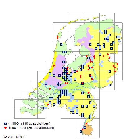 Het aantal atlasblokken (5x5 km) waarin de soort is gemeld binnen een periode van vijf jaar (vanaf 1980) of twintig jaar. Niet gecorrigeerd voor waarnemersinspanning en het aantal doorgegeven waarnemingen kan sterk variëren per periode, dus een trend in verspreiding kan hier niet direct uit worden afgelezen. Het opgegeven jaartal is het eerste jaar van de periode. Bron: gevalideerde waarnemingen uit de NDFF.