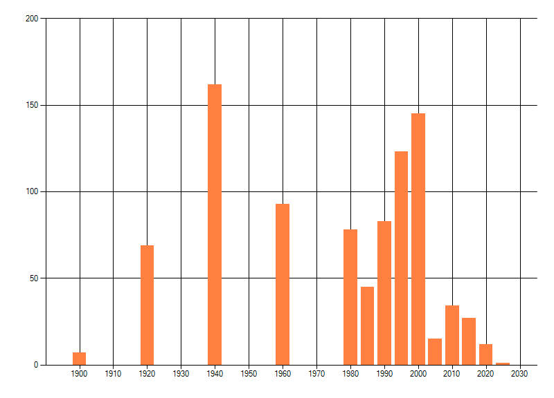 Het aantal atlasblokken (5x5 km) waarin de soort is gemeld binnen een periode van vijf jaar (vanaf 1980) of twintig jaar. Niet gecorrigeerd voor waarnemersinspanning en het aantal doorgegeven waarnemingen kan sterk variëren per periode, dus een trend in verspreiding kan hier niet direct uit worden afgelezen. Het opgegeven jaartal is het eerste jaar van de periode. Bron: gevalideerde waarnemingen uit de NDFF.