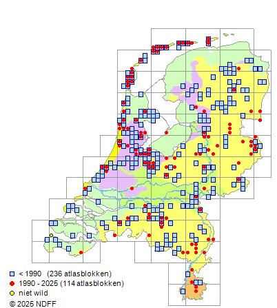 Het aantal atlasblokken (5x5 km) waarin de soort is gemeld binnen een periode van vijf jaar (vanaf 1980) of twintig jaar. Niet gecorrigeerd voor waarnemersinspanning en het aantal doorgegeven waarnemingen kan sterk variëren per periode, dus een trend in verspreiding kan hier niet direct uit worden afgelezen. Het opgegeven jaartal is het eerste jaar van de periode. Bron: gevalideerde waarnemingen uit de NDFF.