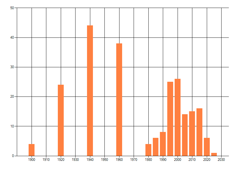 Het aantal atlasblokken (5x5 km) waarin de soort is gemeld binnen een periode van vijf jaar (vanaf 1980) of twintig jaar. Niet gecorrigeerd voor waarnemersinspanning en het aantal doorgegeven waarnemingen kan sterk variëren per periode, dus een trend in verspreiding kan hier niet direct uit worden afgelezen. Het opgegeven jaartal is het eerste jaar van de periode. Bron: gevalideerde waarnemingen uit de NDFF.