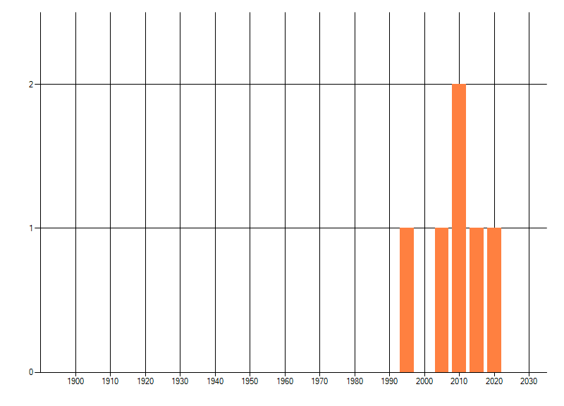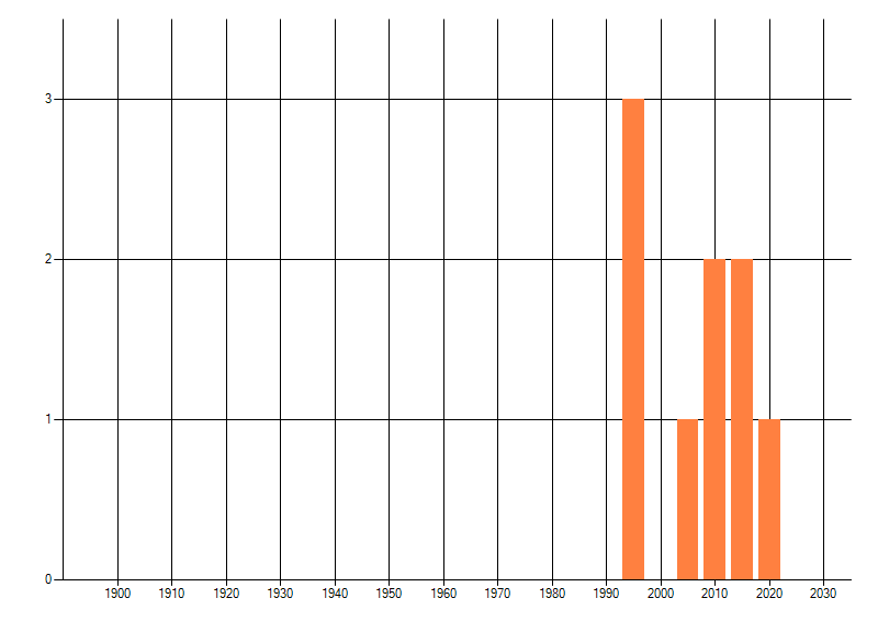 Het aantal atlasblokken (5x5 km) waarin de soort is gemeld binnen een periode van vijf jaar (vanaf 1980) of twintig jaar. Niet gecorrigeerd voor waarnemersinspanning en het aantal doorgegeven waarnemingen kan sterk variëren per periode, dus een trend in verspreiding kan hier niet direct uit worden afgelezen. Het opgegeven jaartal is het eerste jaar van de periode. Bron: gevalideerde waarnemingen uit de NDFF.