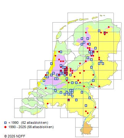 Het aantal atlasblokken (5x5 km) waarin de soort is gemeld binnen een periode van vijf jaar (vanaf 1980) of twintig jaar. Niet gecorrigeerd voor waarnemersinspanning en het aantal doorgegeven waarnemingen kan sterk variëren per periode, dus een trend in verspreiding kan hier niet direct uit worden afgelezen. Het opgegeven jaartal is het eerste jaar van de periode. Bron: gevalideerde waarnemingen uit de NDFF.