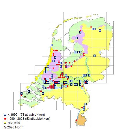 Het aantal atlasblokken (5x5 km) waarin de soort is gemeld binnen een periode van vijf jaar (vanaf 1980) of twintig jaar. Niet gecorrigeerd voor waarnemersinspanning en het aantal doorgegeven waarnemingen kan sterk variëren per periode, dus een trend in verspreiding kan hier niet direct uit worden afgelezen. Het opgegeven jaartal is het eerste jaar van de periode. Bron: gevalideerde waarnemingen uit de NDFF.