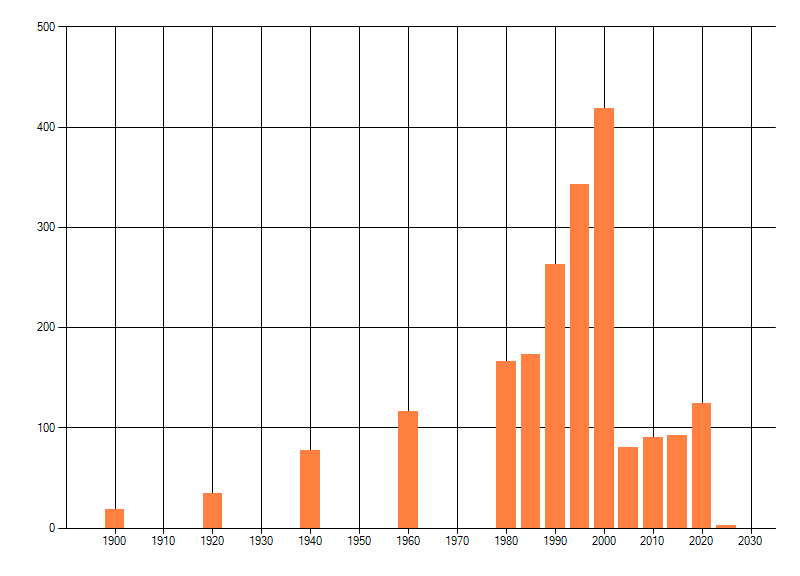 Het aantal atlasblokken (5x5 km) waarin de soort is gemeld binnen een periode van vijf jaar (vanaf 1980) of twintig jaar. Niet gecorrigeerd voor waarnemersinspanning en het aantal doorgegeven waarnemingen kan sterk variëren per periode, dus een trend in verspreiding kan hier niet direct uit worden afgelezen. Het opgegeven jaartal is het eerste jaar van de periode. Bron: gevalideerde waarnemingen uit de NDFF.