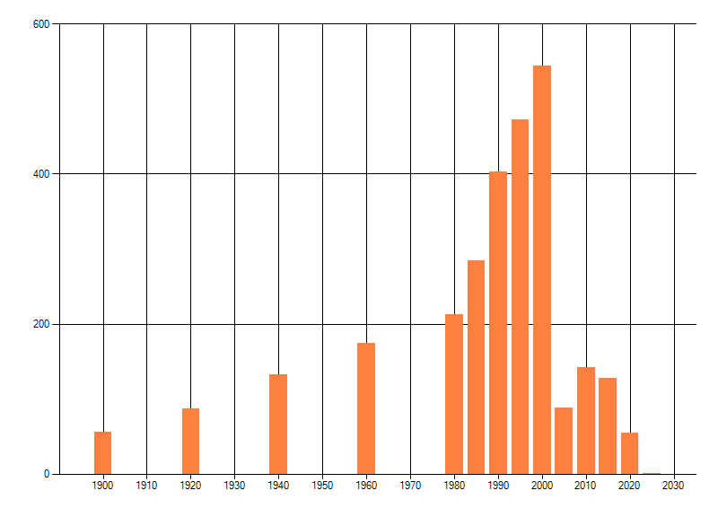Het aantal atlasblokken (5x5 km) waarin de soort is gemeld binnen een periode van vijf jaar (vanaf 1980) of twintig jaar. Niet gecorrigeerd voor waarnemersinspanning en het aantal doorgegeven waarnemingen kan sterk variëren per periode, dus een trend in verspreiding kan hier niet direct uit worden afgelezen. Het opgegeven jaartal is het eerste jaar van de periode. Bron: gevalideerde waarnemingen uit de NDFF.