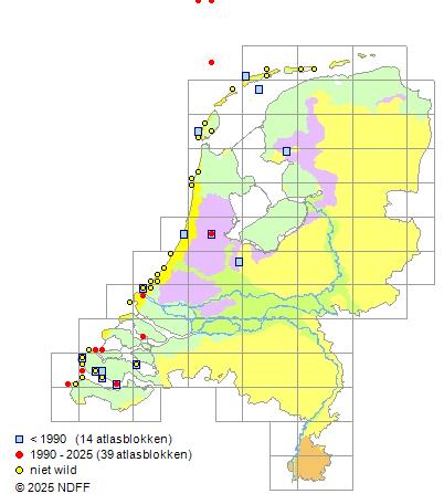 Het aantal atlasblokken (5x5 km) waarin de soort is gemeld binnen een periode van vijf jaar (vanaf 1980) of twintig jaar. Niet gecorrigeerd voor waarnemersinspanning en het aantal doorgegeven waarnemingen kan sterk variëren per periode, dus een trend in verspreiding kan hier niet direct uit worden afgelezen. Het opgegeven jaartal is het eerste jaar van de periode. Bron: gevalideerde waarnemingen uit de NDFF.