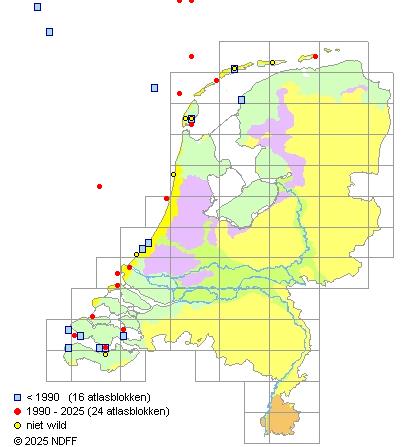Het aantal atlasblokken (5x5 km) waarin de soort is gemeld binnen een periode van vijf jaar (vanaf 1980) of twintig jaar. Niet gecorrigeerd voor waarnemersinspanning en het aantal doorgegeven waarnemingen kan sterk variëren per periode, dus een trend in verspreiding kan hier niet direct uit worden afgelezen. Het opgegeven jaartal is het eerste jaar van de periode. Bron: gevalideerde waarnemingen uit de NDFF.