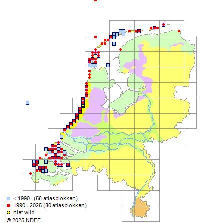 Het aantal atlasblokken (5x5 km) waarin de soort is gemeld binnen een periode van vijf jaar (vanaf 1980) of twintig jaar. Niet gecorrigeerd voor waarnemersinspanning en het aantal doorgegeven waarnemingen kan sterk variëren per periode, dus een trend in verspreiding kan hier niet direct uit worden afgelezen. Het opgegeven jaartal is het eerste jaar van de periode. Bron: gevalideerde waarnemingen uit de NDFF.
