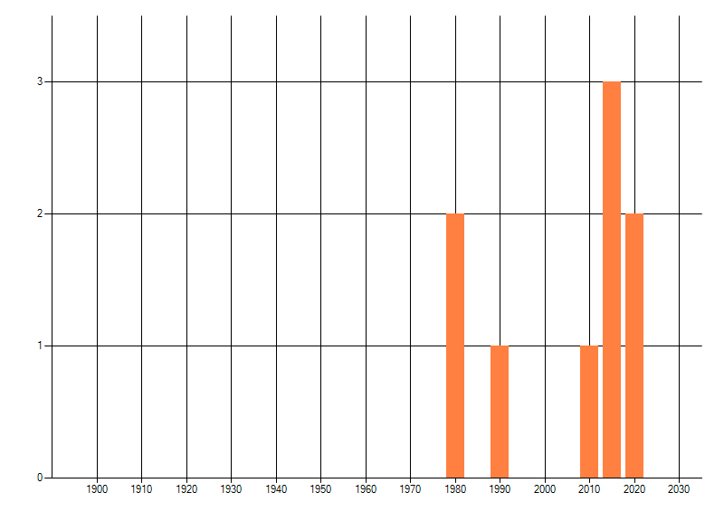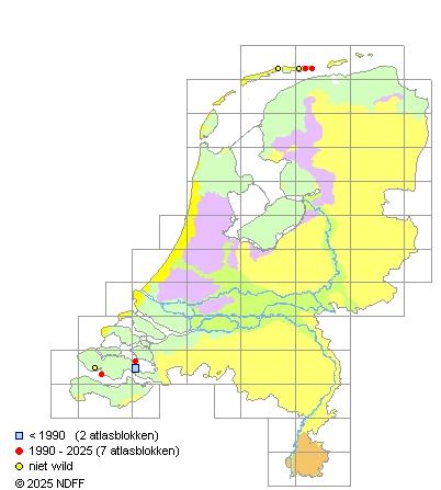 Het aantal atlasblokken (5x5 km) waarin de soort is gemeld binnen een periode van vijf jaar (vanaf 1980) of twintig jaar. Niet gecorrigeerd voor waarnemersinspanning en het aantal doorgegeven waarnemingen kan sterk variëren per periode, dus een trend in verspreiding kan hier niet direct uit worden afgelezen. Het opgegeven jaartal is het eerste jaar van de periode. Bron: gevalideerde waarnemingen uit de NDFF.