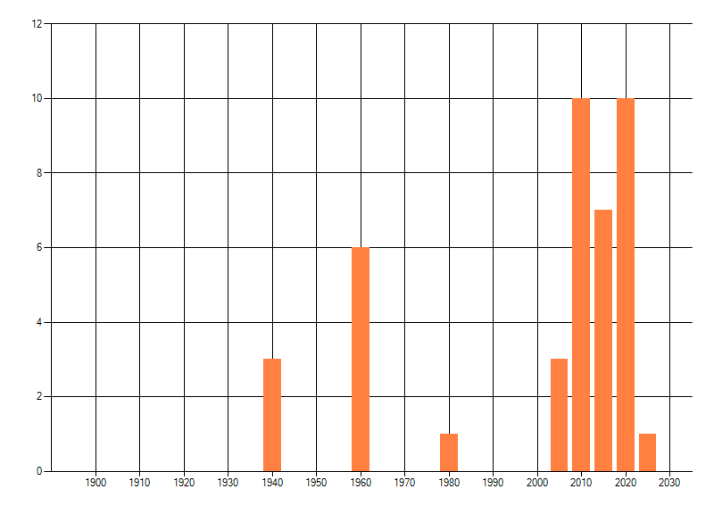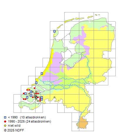 Het aantal atlasblokken (5x5 km) waarin de soort is gemeld binnen een periode van vijf jaar (vanaf 1980) of twintig jaar. Niet gecorrigeerd voor waarnemersinspanning en het aantal doorgegeven waarnemingen kan sterk variëren per periode, dus een trend in verspreiding kan hier niet direct uit worden afgelezen. Het opgegeven jaartal is het eerste jaar van de periode. Bron: gevalideerde waarnemingen uit de NDFF.