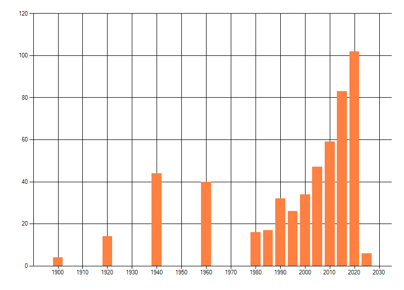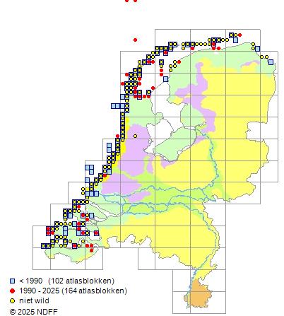 Het aantal atlasblokken (5x5 km) waarin de soort is gemeld binnen een periode van vijf jaar (vanaf 1980) of twintig jaar. Niet gecorrigeerd voor waarnemersinspanning en het aantal doorgegeven waarnemingen kan sterk variëren per periode, dus een trend in verspreiding kan hier niet direct uit worden afgelezen. Het opgegeven jaartal is het eerste jaar van de periode. Bron: gevalideerde waarnemingen uit de NDFF.