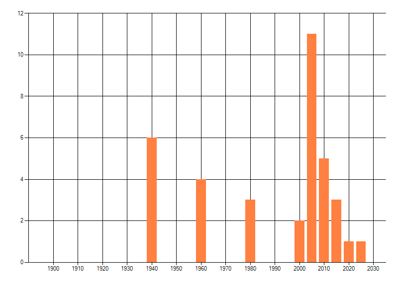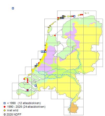 Het aantal atlasblokken (5x5 km) waarin de soort is gemeld binnen een periode van vijf jaar (vanaf 1980) of twintig jaar. Niet gecorrigeerd voor waarnemersinspanning en het aantal doorgegeven waarnemingen kan sterk variëren per periode, dus een trend in verspreiding kan hier niet direct uit worden afgelezen. Het opgegeven jaartal is het eerste jaar van de periode. Bron: gevalideerde waarnemingen uit de NDFF.