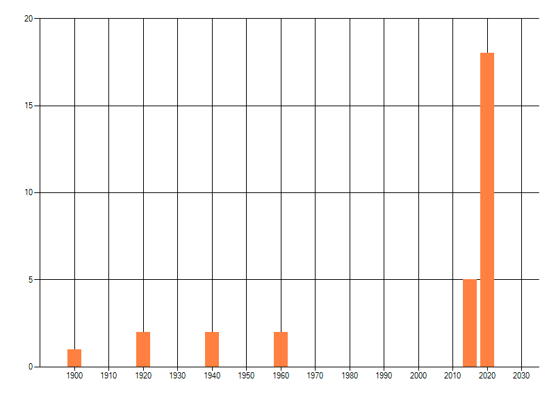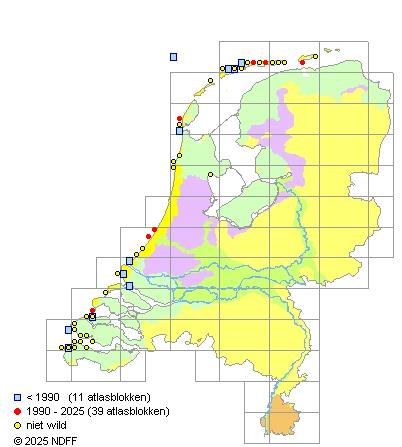 Het aantal atlasblokken (5x5 km) waarin de soort is gemeld binnen een periode van vijf jaar (vanaf 1980) of twintig jaar. Niet gecorrigeerd voor waarnemersinspanning en het aantal doorgegeven waarnemingen kan sterk variëren per periode, dus een trend in verspreiding kan hier niet direct uit worden afgelezen. Het opgegeven jaartal is het eerste jaar van de periode. Bron: gevalideerde waarnemingen uit de NDFF.