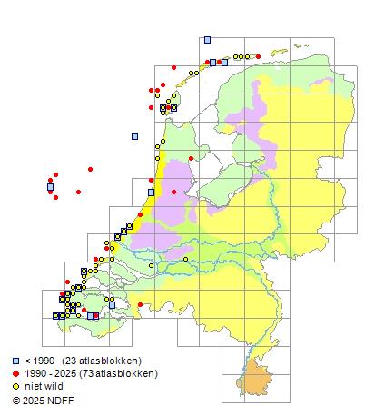 Het aantal atlasblokken (5x5 km) waarin de soort is gemeld binnen een periode van vijf jaar (vanaf 1980) of twintig jaar. Niet gecorrigeerd voor waarnemersinspanning en het aantal doorgegeven waarnemingen kan sterk variëren per periode, dus een trend in verspreiding kan hier niet direct uit worden afgelezen. Het opgegeven jaartal is het eerste jaar van de periode. Bron: gevalideerde waarnemingen uit de NDFF.