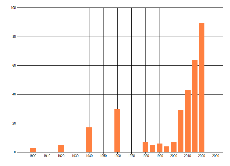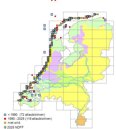 Het aantal atlasblokken (5x5 km) waarin de soort is gemeld binnen een periode van vijf jaar (vanaf 1980) of twintig jaar. Niet gecorrigeerd voor waarnemersinspanning en het aantal doorgegeven waarnemingen kan sterk variëren per periode, dus een trend in verspreiding kan hier niet direct uit worden afgelezen. Het opgegeven jaartal is het eerste jaar van de periode. Bron: gevalideerde waarnemingen uit de NDFF.