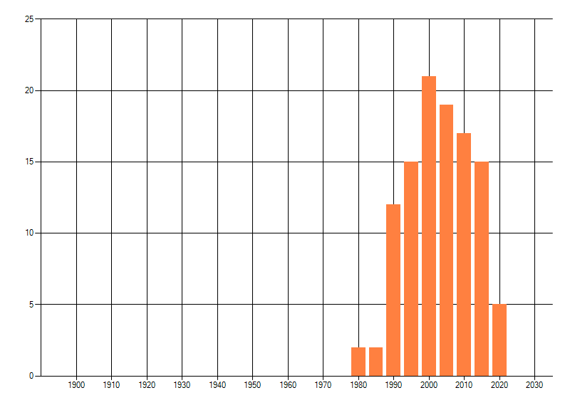 Het aantal atlasblokken (5x5 km) waarin de soort is gemeld binnen een periode van vijf jaar (vanaf 1980) of twintig jaar. Niet gecorrigeerd voor waarnemersinspanning en het aantal doorgegeven waarnemingen kan sterk variëren per periode, dus een trend in verspreiding kan hier niet direct uit worden afgelezen. Het opgegeven jaartal is het eerste jaar van de periode. Bron: gevalideerde waarnemingen uit de NDFF.