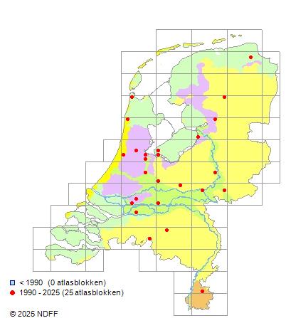 Het aantal atlasblokken (5x5 km) waarin de soort is gemeld binnen een periode van vijf jaar (vanaf 1980) of twintig jaar. Niet gecorrigeerd voor waarnemersinspanning en het aantal doorgegeven waarnemingen kan sterk variëren per periode, dus een trend in verspreiding kan hier niet direct uit worden afgelezen. Het opgegeven jaartal is het eerste jaar van de periode. Bron: gevalideerde waarnemingen uit de NDFF.