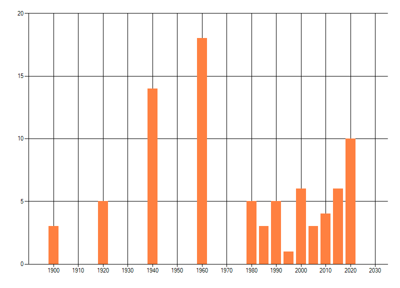 Het aantal atlasblokken (5x5 km) waarin de soort is gemeld binnen een periode van vijf jaar (vanaf 1980) of twintig jaar. Niet gecorrigeerd voor waarnemersinspanning en het aantal doorgegeven waarnemingen kan sterk variëren per periode, dus een trend in verspreiding kan hier niet direct uit worden afgelezen. Het opgegeven jaartal is het eerste jaar van de periode. Bron: gevalideerde waarnemingen uit de NDFF.