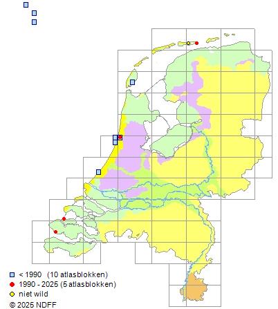 Het aantal atlasblokken (5x5 km) waarin de soort is gemeld binnen een periode van vijf jaar (vanaf 1980) of twintig jaar. Niet gecorrigeerd voor waarnemersinspanning en het aantal doorgegeven waarnemingen kan sterk variëren per periode, dus een trend in verspreiding kan hier niet direct uit worden afgelezen. Het opgegeven jaartal is het eerste jaar van de periode. Bron: gevalideerde waarnemingen uit de NDFF.