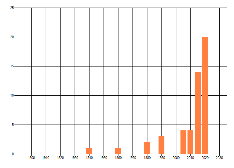 Het aantal atlasblokken (5x5 km) waarin de soort is gemeld binnen een periode van vijf jaar (vanaf 1980) of twintig jaar. Niet gecorrigeerd voor waarnemersinspanning en het aantal doorgegeven waarnemingen kan sterk variëren per periode, dus een trend in verspreiding kan hier niet direct uit worden afgelezen. Het opgegeven jaartal is het eerste jaar van de periode. Bron: gevalideerde waarnemingen uit de NDFF.