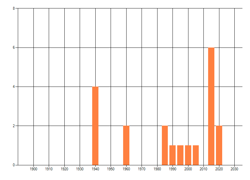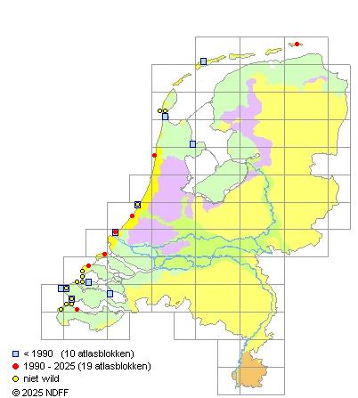 Het aantal atlasblokken (5x5 km) waarin de soort is gemeld binnen een periode van vijf jaar (vanaf 1980) of twintig jaar. Niet gecorrigeerd voor waarnemersinspanning en het aantal doorgegeven waarnemingen kan sterk variëren per periode, dus een trend in verspreiding kan hier niet direct uit worden afgelezen. Het opgegeven jaartal is het eerste jaar van de periode. Bron: gevalideerde waarnemingen uit de NDFF.